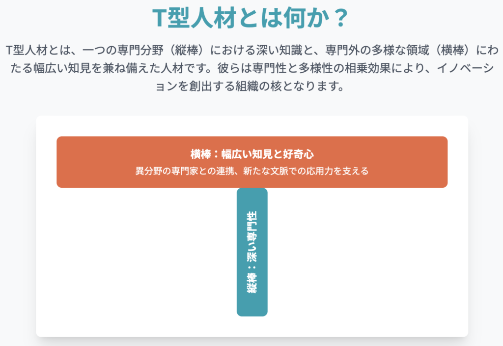 T型人材を単に「スペシャリストとゼネラリストの両方の性質を持つ人材」と理解するのは、その本質を見誤る可能性がある。重要なのは、T型人材が二つの特性の単純な「足し算」ではなく、両者が相互に作用し合う「掛け算」によって生まれるハイブリッドな存在であるという点である 4。