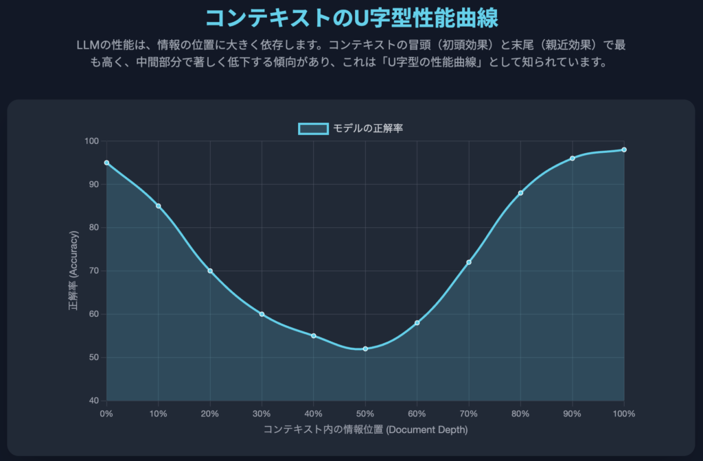 LITM現象を最も象徴的に可視化したのが、「U字型の性能曲線」である 7。このグラフは、縦軸にモデルの正解率(Accuracy)、横軸に関連情報がコンテキスト内に配置された位置(Document Depth)を取ることで生成される。性能はコンテキストの冒頭(初頭効果)と末尾(親近効果)で最も高くなり、中間部分で大きく落ち込むため、グラフは明確な「U」の字を描く 7。このパターンは、人間が長いリストや書籍の内容を記憶する際に、最初と最後の章はよく覚えているが、中間の章の内容は曖昧になりがちな現象と類似している 21。