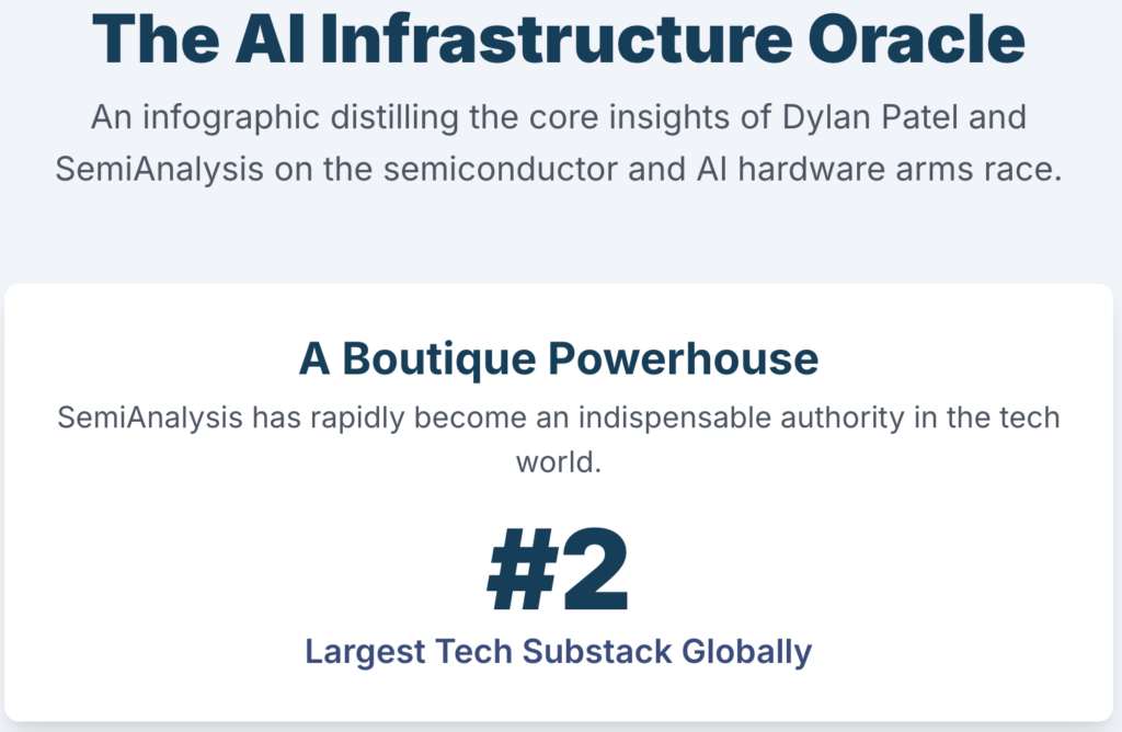 SemiAnalysisの創設者、CEO、兼チーフアナリストであるディラン・パテルは、人工知能(AI)と半導体産業における第一人者としての地位を確立しています。2020年以来、ソロベンチャーから結束力のある専門チームへと進化を遂げた同社は、半導体サプライチェーンからクラウドエコシステム、機械学習モデルに至るまで、業界の最も戦略的かつ複雑な課題に対して、比類のない詳細な分析を提供しています。SemiAnalysisの中核をなすビジネスモデルは、世界で2番目に大きな技術系Substackとして広範な影響力を持ち、それを通じて獲得した知名度と信頼性を、付加価値の高いコンサルティングサービスと独自の調査モデルに結びつけるというものです 1。