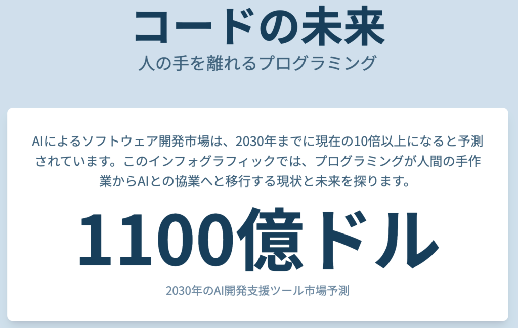 | AIコードツール | Microsoft (GitHub), Amazon, Google | 48億 27 | 301億 (2032年) 27 | 23.2% 27 | DevOpsの普及、開発者生産性向上ニーズ |