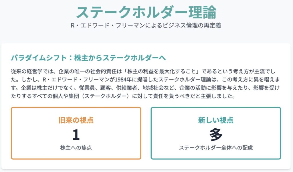 さらに、企業の社会的責任(CSR)という概念も1960年代後半から1970年代初頭にかけて一般化し、フリーマンの理論形成に影響を与えた 4。イタリアの経済学者ジャンカルロ・パラヴィチーニが1968年に企業の倫理的、社会的、環境的側面を評価する手法を提唱するなど 4、企業の役割を経済的側面以外からも捉えようとする試みは、フリーマン以前にも存在した。これらの先行する議論や社会の変化が、フリーマンがステークホルダーの概念を体系的かつ包括的な理論へと昇華させる土壌を提供したのである。