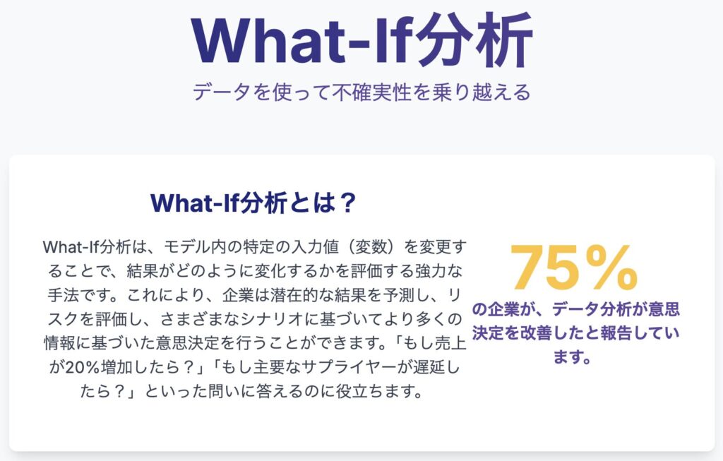 What-if分析の予測結果は、意思決定者がリスクを考慮しながら戦略を評価できるように、複数の側面から提示されます 3。