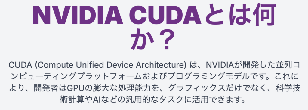 - 【初心者向け】CUDAって何?NVIDIAのGPUで計算を爆速にする魔法を徹底解説! https://saycon.co.jp/archives/neta/%E3%80%90%E5%88%9D%E5%BF%83%E8%80%85%E5%90%91%E3%81%91%E3%80%91cuda%E3%81%A3%E3%81%A6%E4%BD%95%EF%BC%9Fnvidia%E3%81%AEgpu%E3%81%A7%E8%A8%88%E7%AE%97%E3%82%92%E7%88%86%E9%80%9F%E3%81%AB%E3%81%99