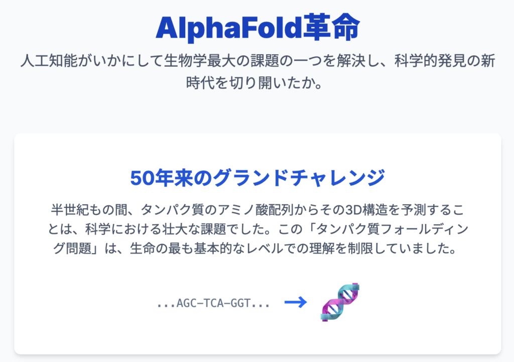 AlphaFoldは、50年来の科学的難問であったタンパク質フォールディング問題に対して、深層学習というアプローチで歴史的なブレークスルーを達成した。その中核であるAlphaFold 2は、進化情報と革新的なAIアーキテクチャ「Evoformer」を組み合わせることで、多くのタンパク質に対して実験に匹敵する精度での構造予測を可能にし、構造生物学におけるパラダイムシフトを引き起こした。