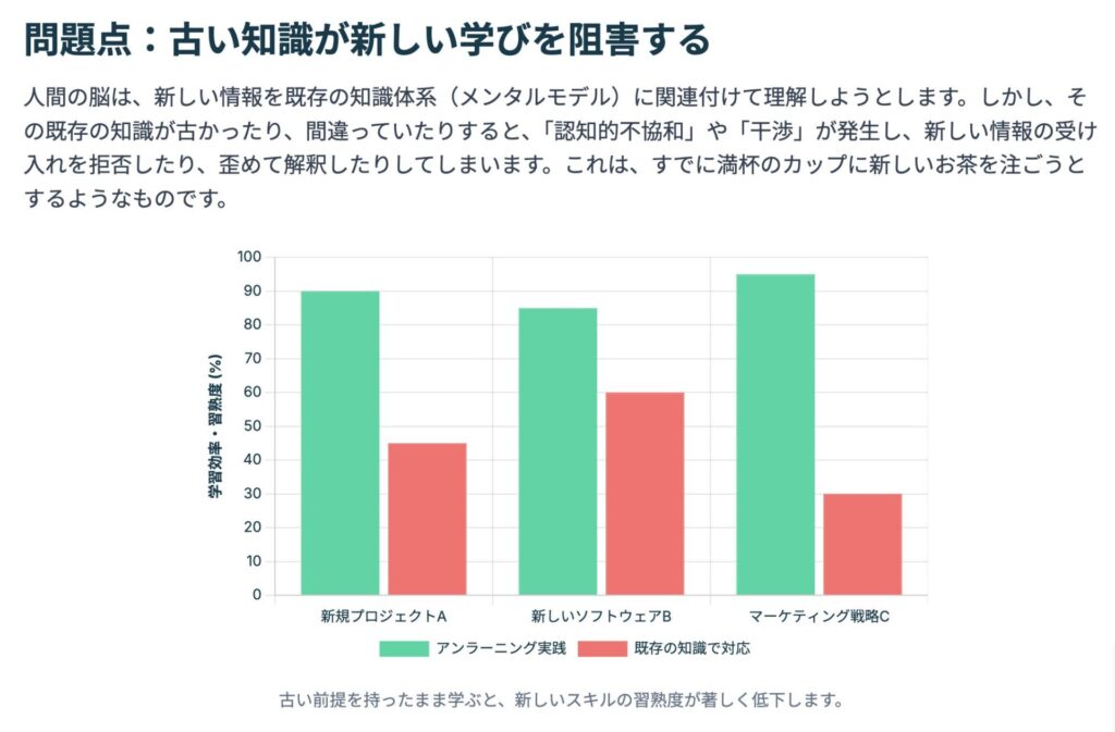 これらの環境下では、既存の知識に新しい知識を積み上げるだけの伝統的な付加的学習(ラーニング)はもはや十分ではない 11。時代遅れの土台の上に新しい知識を積み上げることは、砂上の楼閣を築くようなものである。アンラーニングとは、その砂を掘り起こし、確固たる岩盤に到達するための不可欠なプロセスなのである。
