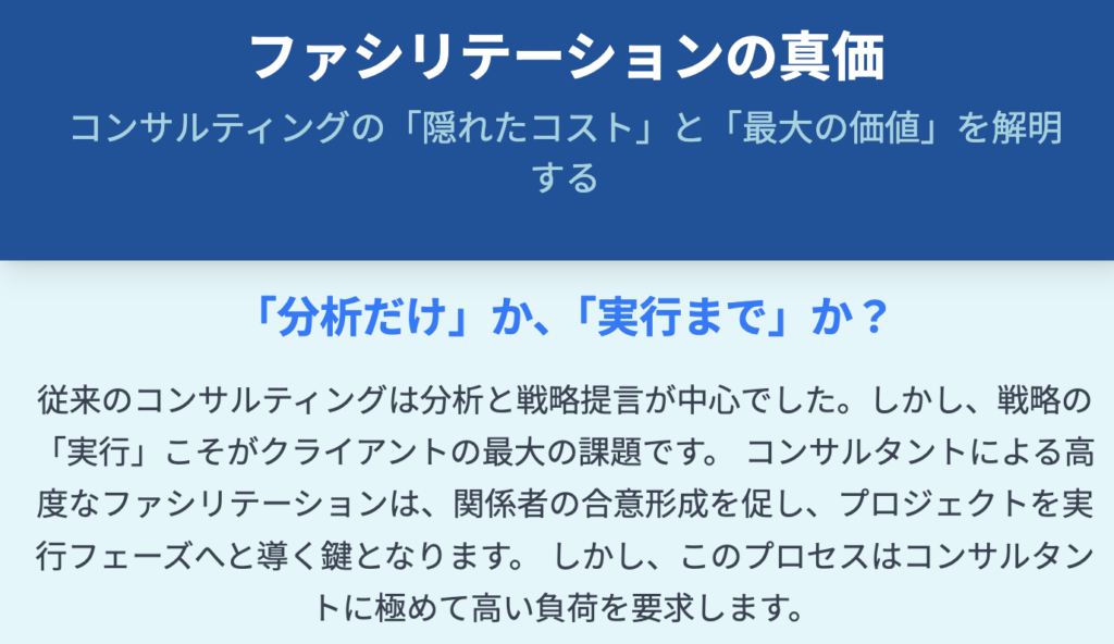 3. 価値とリスク軽減:コンサルティングのバリューチェーンにおける最も脆弱な環である「実行」フェーズのリスクを低減し、組織的な合意形成を確実にするという、実証可能な価値の提供。