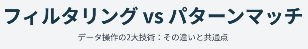 - 抽象度の違い: 最も基本的なレベルにおいて、フィルタリングは「目的(選別・除外)」5 であり、パターンマッチは「手段(一致・検出)」7 である。
