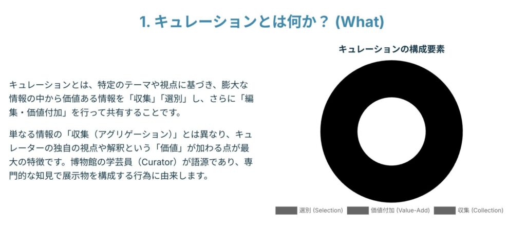 - キュレーションは、「既存の情報を整理・編集」し、「信頼性の高い情報を提供」するプロセスである 7。これは「1を10にする」、あるいは「AとBを組み合わせて新たな価値Cを生み出す」行為である。