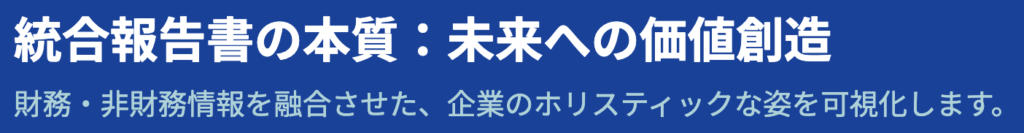 - 信頼関係の強化: 財務情報と非財務情報を統合的に開示することで、ステークホルダーからの信頼を高め、長期的なビジネスの発展に寄与します 4。