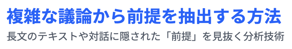 複雑かつ長文の議論、特に哲学的、法的、あるいは社会的な議論の多くは、著者が明示的には述べていない「隠れた前提(Hidden Assumptions)」または「暗黙の仮定(Warrants)」に深く依存しています 17。これらの水面下の前提を特定し、明示的に定式化することは、前提抽出のプロセスにおいて最も高度かつ決定的なステップです。