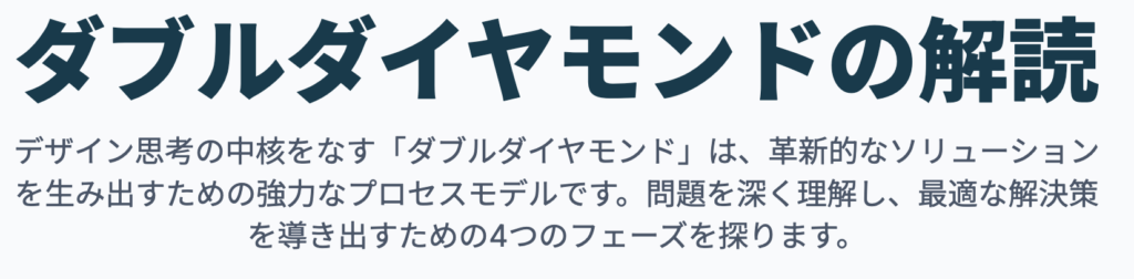 すべてのモデルが類似した原則を共有する中で、ダブルダイヤモンドが持つ独自の強みは、その視覚的な構造、すなわち**「問題空間(Diamond 1)」と「解決空間(Diamond 2)」を明確に分離**して提示する点にあります 5