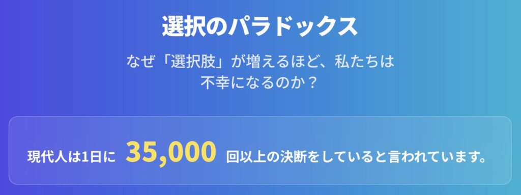 - 満足度の低下(Dissatisfaction): 最適な選択をしたとしても、「もっと良い選択肢があったかもしれない」という疑念が消えず、決定後の満足度が低下する。