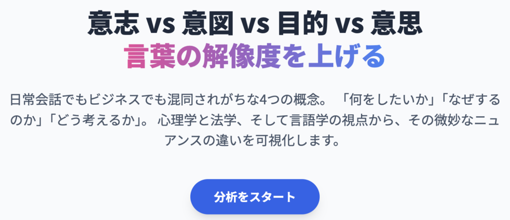 | 英語対応 | Will, Volition | Intention, Will (legal) | Intention, Aim, Intent | Purpose, Goal, End |