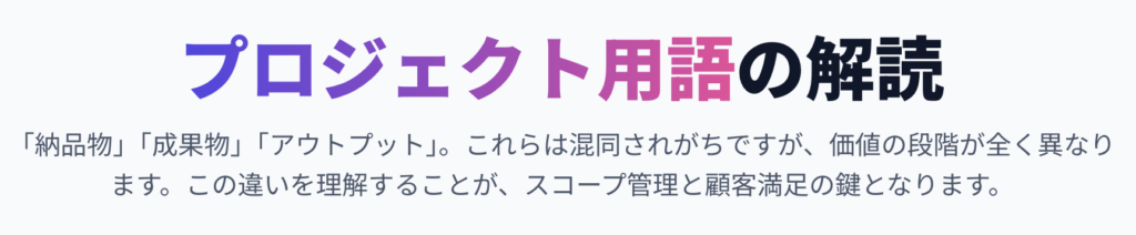 1. 用語の定義の統一:組織内およびプロジェクト開始時に、これら三つの言葉の定義を明確にし、ステークホルダー間で合意形成を行うこと。特に「納品物」の範囲に関しては、契約書レベルでの厳密な記述を徹底し、将来の紛争を予防すべきである。