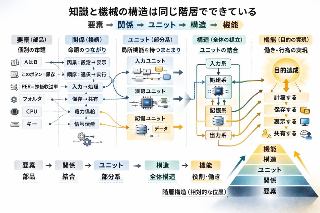 まず最も基本にあるのは要素である。機械で言えば部品だ。ネジ、歯車、モーター、センサーといった単体の構成要素である。知識の世界で言えば、これは個別の命題に対応する。例えば「PERは株価収益率である」「このボタンは保存を実行する」といった単独で成立する知識である。