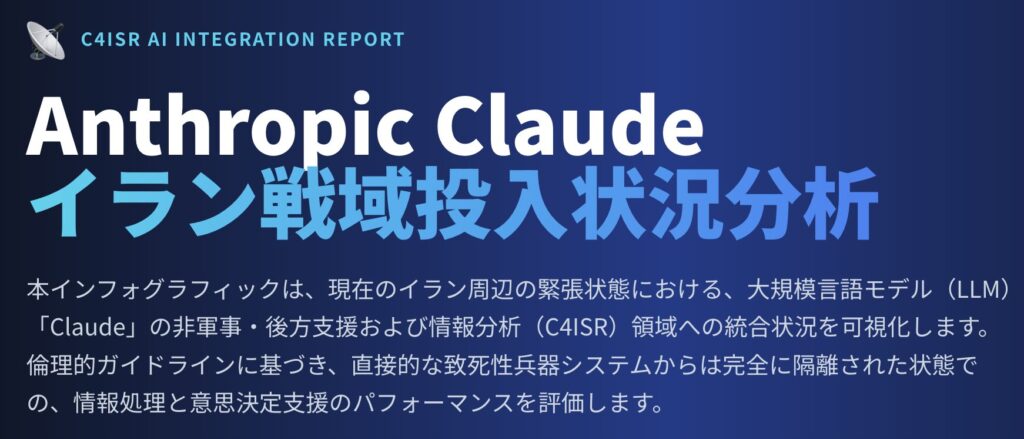 この前例のない規模と速度を伴う軍事作戦を技術的に可能にした中核的要素が、人工知能(AI)の兵器化、具体的には民間企業Anthropic社が開発した大規模言語モデル(LLM)「Claude」の戦術的統合である3。米軍の作戦立案および標的選定プロセスにおいて、Claudeは高度な意思決定支援システムとして機能し、「キルチェーン(目標識別から法的承認、攻撃実行に至る一連の軍事プロセス)」を歴史上かつてない水準にまで短縮した3。