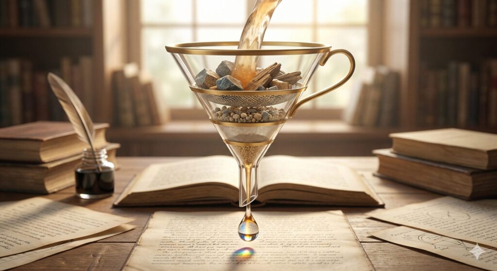 ただし、漏瑚の比喩には一つ注意がいる。濾過は不純物を取り除く作業だが、推敲は必ずしもそうではない。削ることもあれば、足すこともある。言い換えることもある。むしろ推敲の本質は、除去ではなく置換に近い。輪郭のぼやけたものを一文で言い切れるものに、手応えのない表現を読者の手が止まる表現に、入れ替えていく。漏瑚が液体を澄ませるように、推敲は文章の画素数を上げていく。