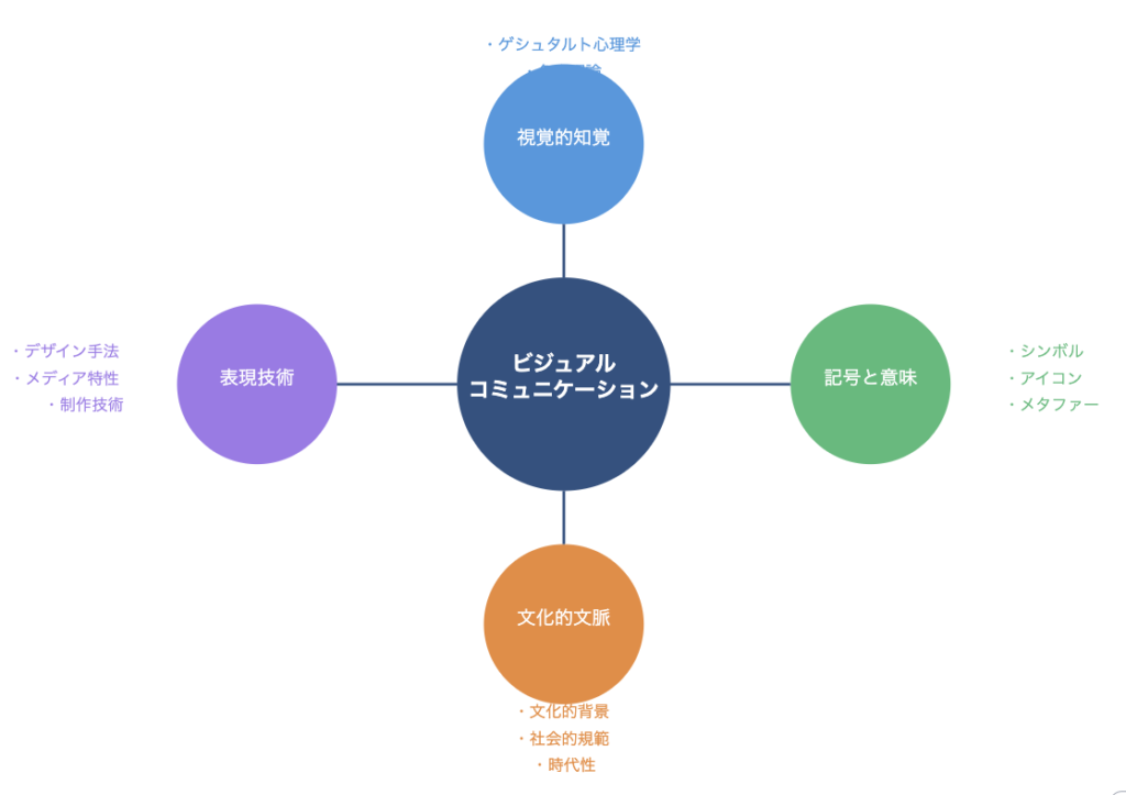 ビジュアルコミュニケーション理論は、視覚的な情報がどのように伝達され、理解されるかを体系的に研究する学問分野です。この理論は以下の4つの主要な要素から構成されています。
