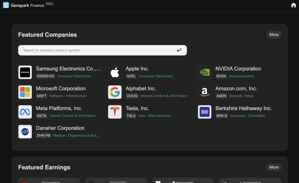 Genspark Financeでは、最新の財務情報や企業データを定期的に更新し、投資家がリアルタイムに市場動向を把握できるよう、月次パッケージとして提供しています。これにより、投資判断に必要な基礎データが迅速かつ正確に取得できます。 - Featured CompaniesとRecent Featured Reports