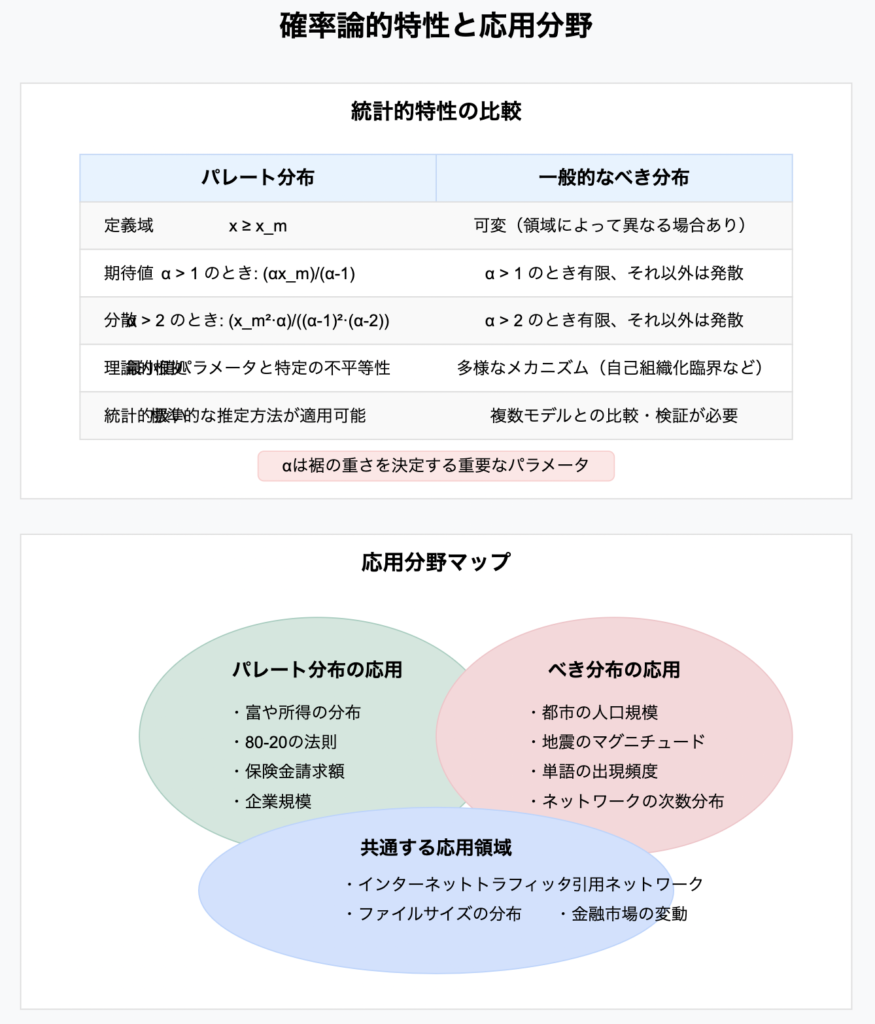 - 統計的扱い:パレート分布はより標準的な統計手法で扱えますが、一般的なべき分布の識別と推定はより複雑です。