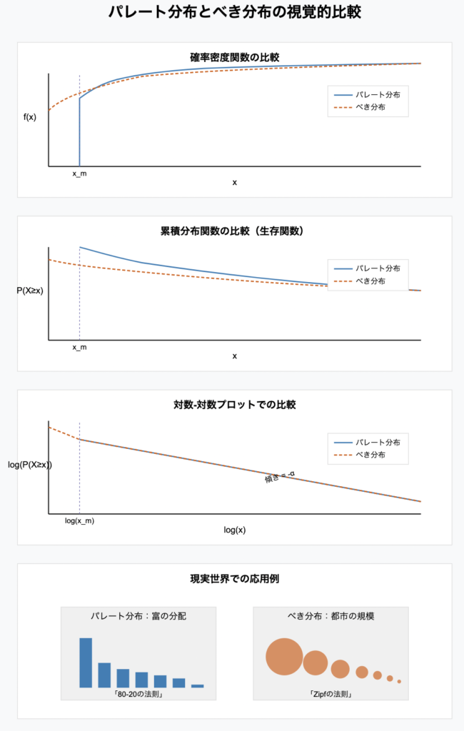 理論的な違い:パレート分布は特定の仮定(最小値の存在と特定のべき乗則)から導かれるのに対し、べき分布はより多様な生成メカニズムを持つことができます。