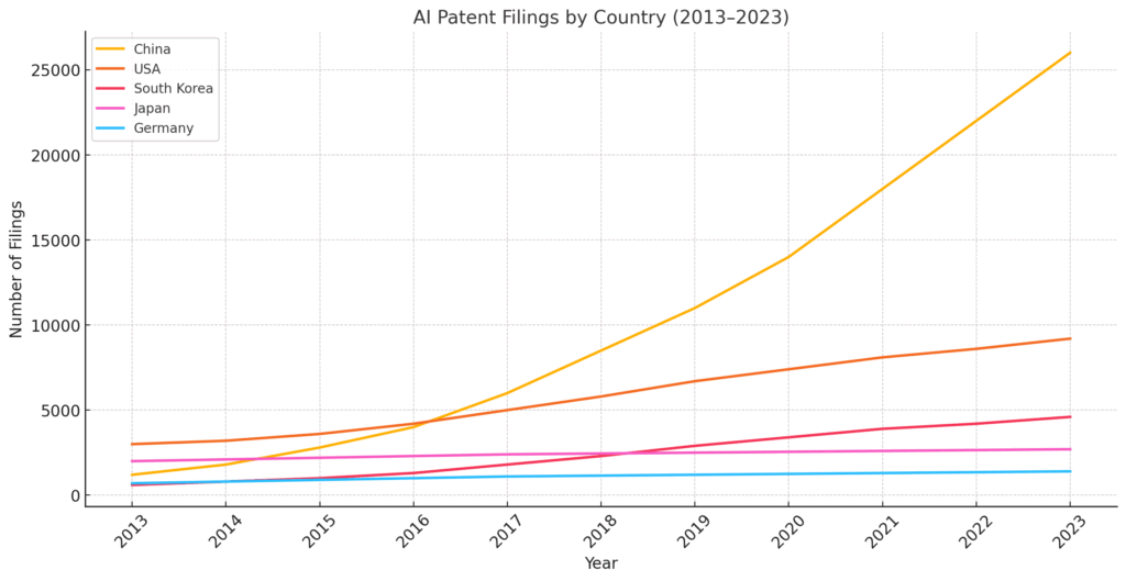 以下は、主要5カ国におけるAI特許出願の推移です: