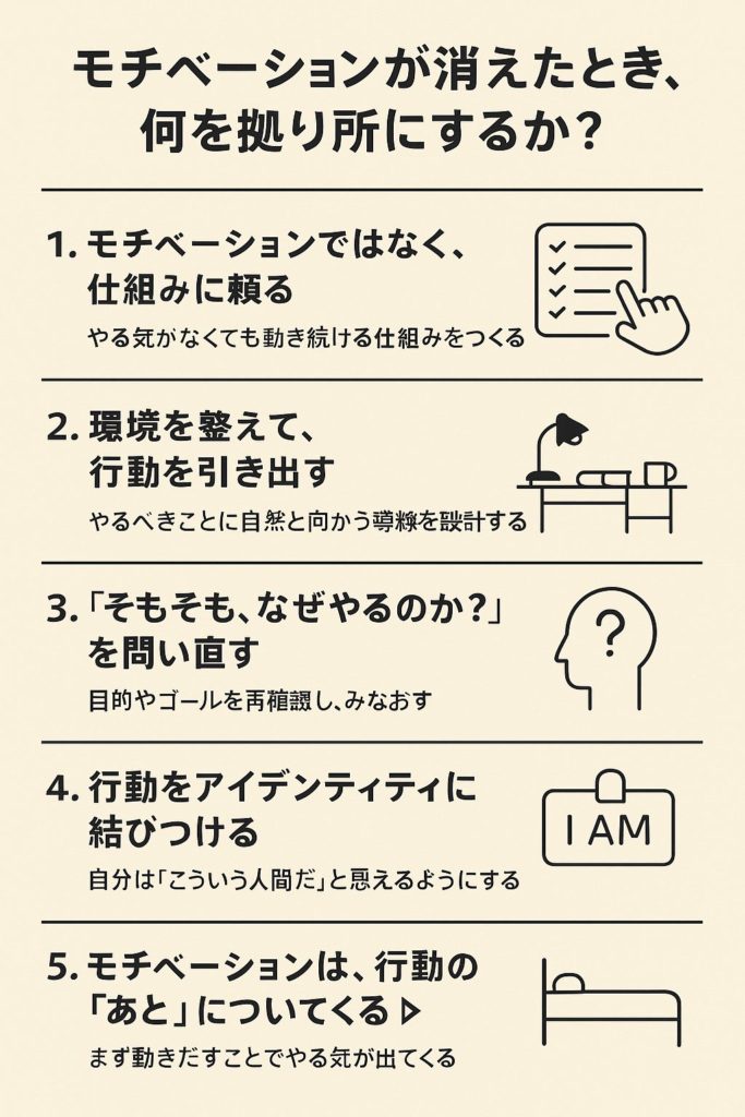 モチベーションとは一時的な感情の波です。高まることもあれば、消えることもある。だからこそ、行動の継続には“やる気に頼らない仕組み”が必要になります。