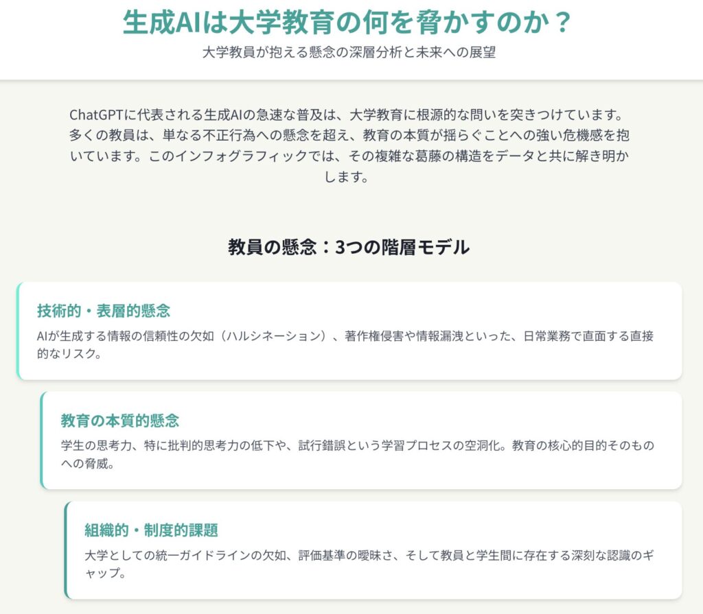 これらの多層的かつ複合的な分析を通じて、本レポートは最終的に、生成AIという脅威を大学教育の本質を問い直し、進化させるための「触媒」として捉え直し、未来に向けた建設的な提言を導出することを目指す。