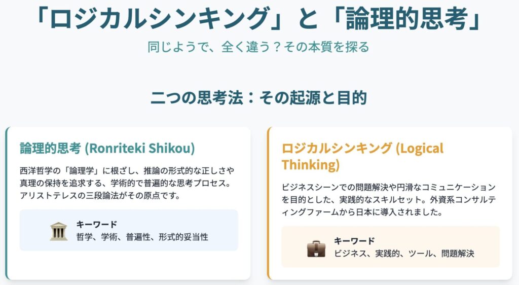 | 語源・背景 | 西洋の「Logic」(論理学)の訳語として明治期に定着 8。哲学・学術的起源が強い 1。 | 英語の”logical thinking”に由来するカタカナ語 8。主に1980年代後半からの外資系コンサルティング業界を通じて普及 8。 |