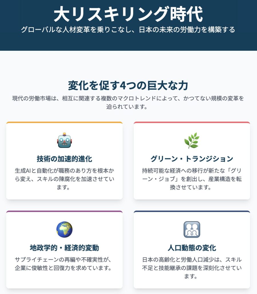 これらの四つの力は、それぞれが独立して存在するのではなく、互いに影響を及ぼし合う一つのシステムを形成している。例えば、グリーン・トランジションはAIによるエネルギー効率管理といった新技術を必要とし、その技術を開発・運用するのは高齢化が進む労働力であり、そのための部品供給は変動するグローバル・サプライチェーンに依存している。このような複雑に絡み合った圧力の中で、企業や国家が生き残るためには、労働力全体のスキルセットを継続的に再構築する「グレート・リスキリング」以外に選択肢はないのである。