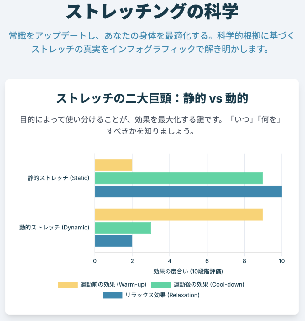 ストレッチングを「万能薬」として盲信するのではなく、「精密なツール」として賢明に活用することが、その恩恵を最大限に引き出す鍵である。運動前のウォーミングアップには神経系を活性化させる動的ストレッチングを、運動後や就寝前のリラクゼーションには副交感神経を優位にする静的ストレッチングを選択するというように、画一的なアプローチを捨て、目的に応じて最適な手法を使い分ける必要がある。