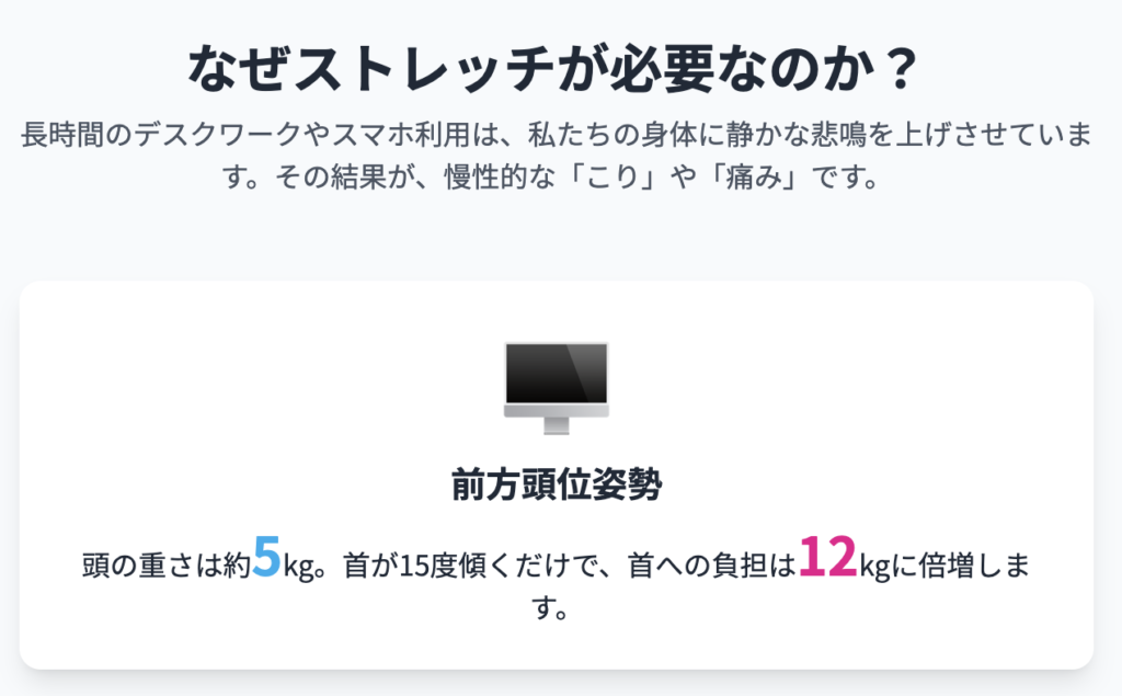 この静的かつ前方屈曲した姿勢は、身体の前面筋群(胸部など)の適応性短縮と、背面筋群(首、背中)への持続的な伸張ストレスという、深刻な筋バランスの不均衡を引き起こします。この不均衡こそが、慢性的な首の痛み、肩こり、そして緊張性頭痛といった現代病の主要な引き金となるのです。したがって、ストレッチングは単なる運動ではなく、現代生活の負のパターンを打ち消し、身体を本来あるべきニュートラルな状態へとリセットするための、不可欠な修正的介入と位置づけられます。
